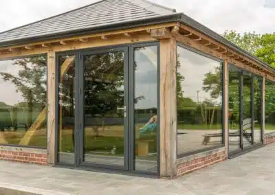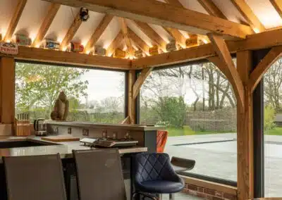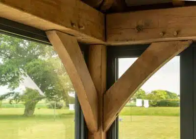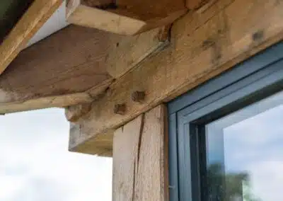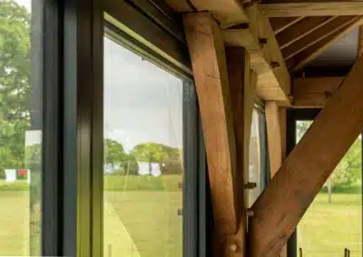 Recognizing the challenges associated with working with green oak, a material known for its propensity to expand, twist, and contract, the owners proactively collaborated with the esteemed professionals at Windows Etc to overcome this hurdle. Together, they tackled the unique demands posed by green oak, with a keen focus on finding solutions that would adapt to its natural behavior. As a result, the glazing components were intentionally produced slightly under-size to allow for size variation, with meticulous attention given to the inclusion of matching trim that seamlessly concealed any expansion gaps.