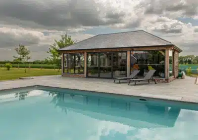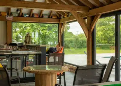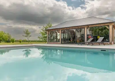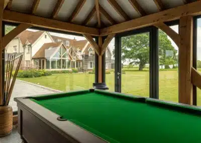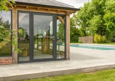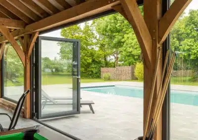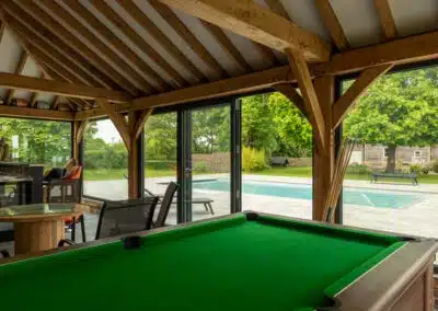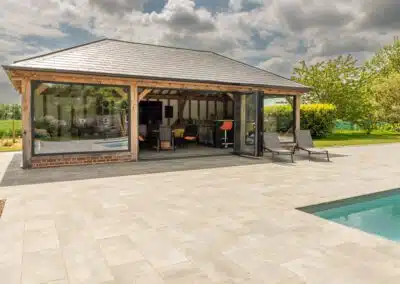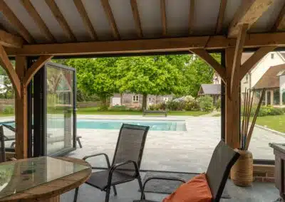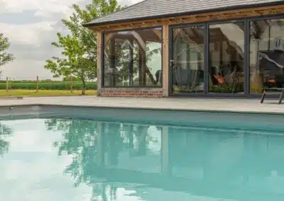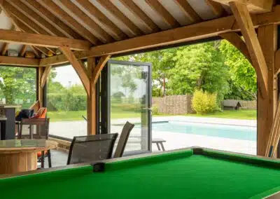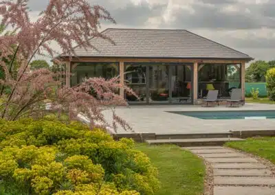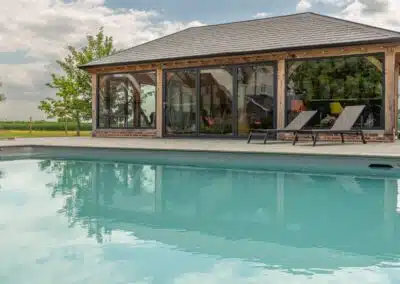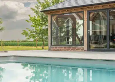 The owners of this exquisitely designed pool house embarked on a remarkable journey as they undertook a supported self-build project. With unwavering determination, they laid the foundations and eagerly awaited the arrival of a unique self-build cart-lodge kit, with a centre bay wider than its adjacent counterparts, creating a captivating asymmetrical centre door.